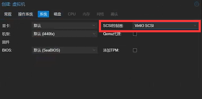 在“系统”栏中将SCSI控制器更改为“Virtlo SCSI”