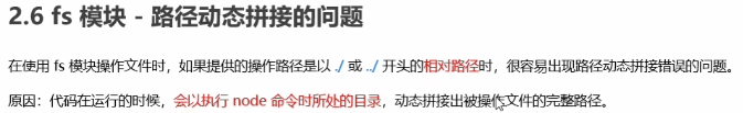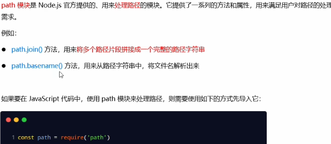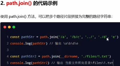 console.log(pathStr); // 输出: \a\b\d\e注意:今后凡是涉及到路径拼接的操作,都要使用 path.join() 方法进行处理。不要直接使用+进行字符串的拼接。