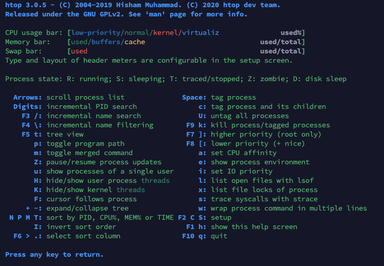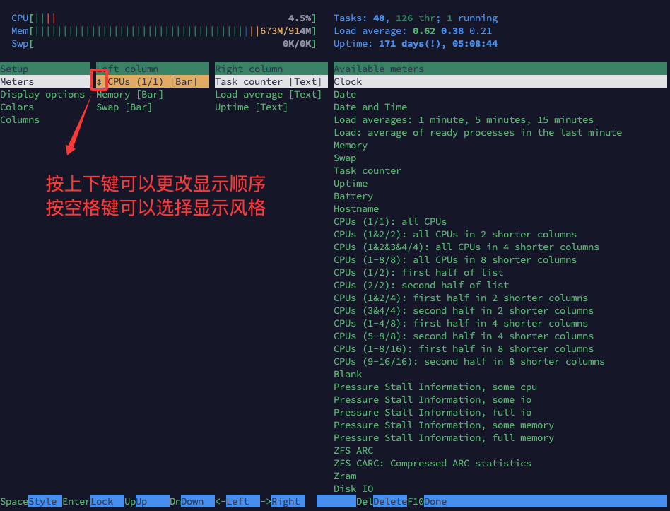 F1 | 查看帮助,解释计量器颜色含义、进程状态和键盘快捷键等信息 |