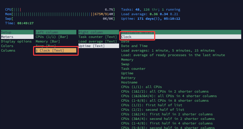 我们可以根据自己的需要修改显式模式以及想要显示的内容,比如:以LED的形式显示CPU的使用情况,并且在左边的区域添加hostname,在右边的区区域添加clock