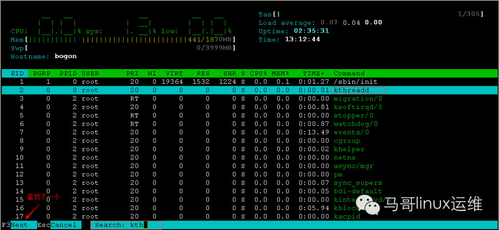 - search会将光标定位到符合条件的进程上,通过F3键进行逐个查找;