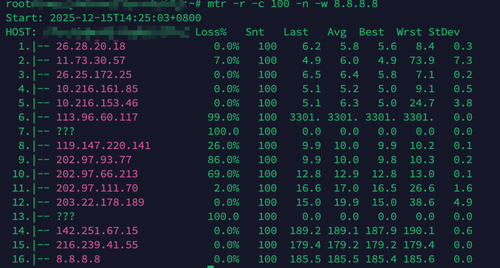 mtr -z example.com通过TCP的方式来mtr(防止有一些服务器禁用ICMP):