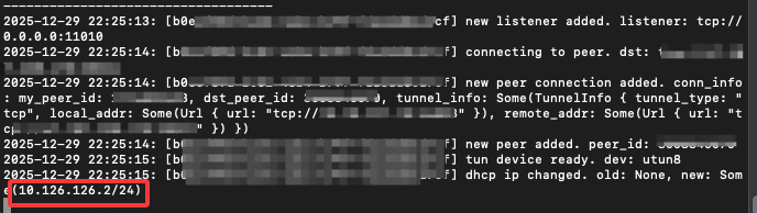 启动完成后你会发现已经给你分配了一个虚拟IP默认的IP段为 10.126.126.X ),如果你需要指定相关的IP段可以添加一下参数来启动: