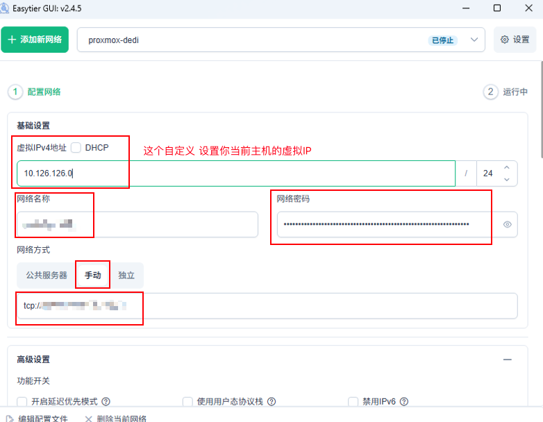 easytier-core -i <给你的proxmox设置一个专属内网地址 方便区分> --network-name <你的网络名称> --network-secret <你的网络密码> -p tcp://<服务器地址>(不止tcp 其他都可以)